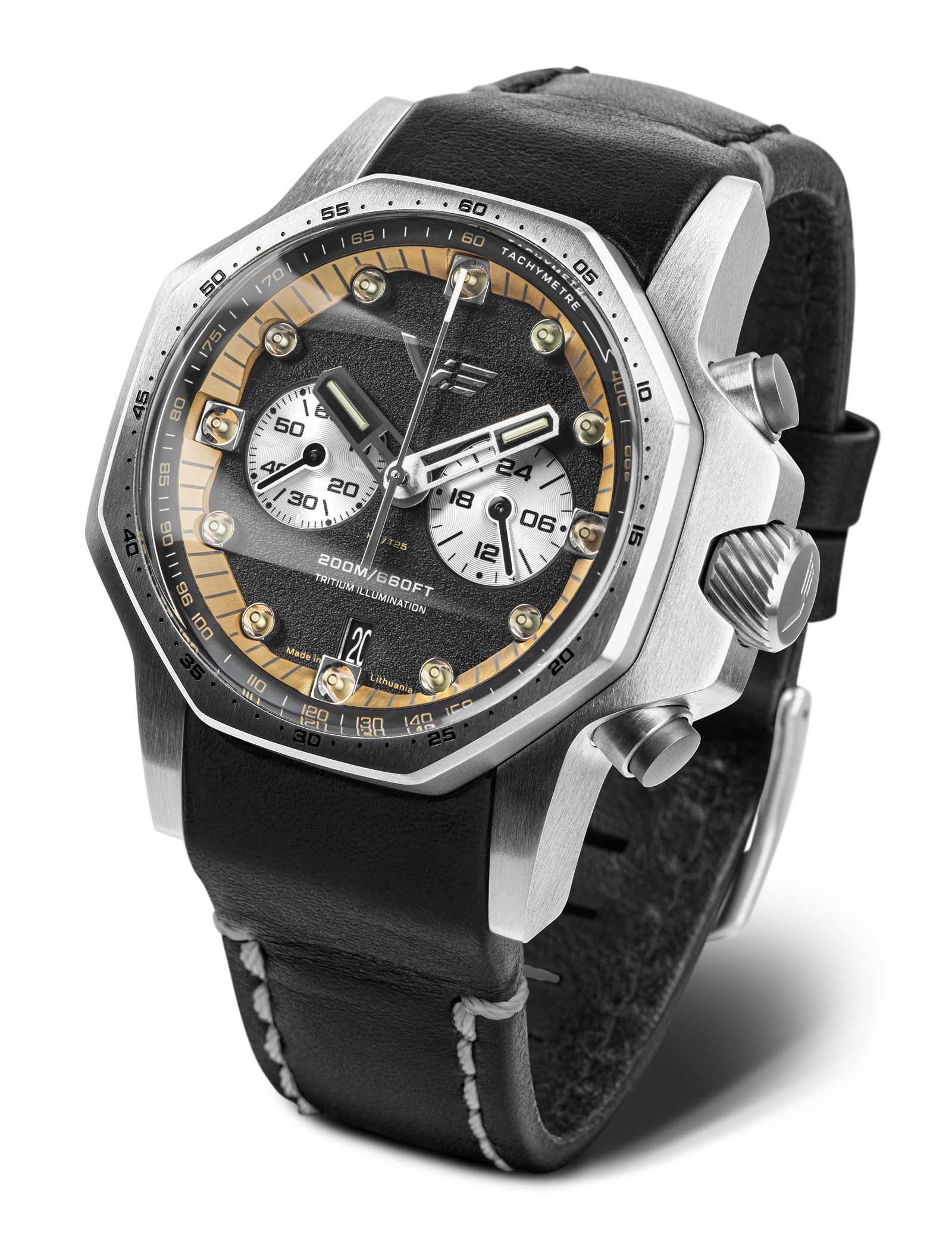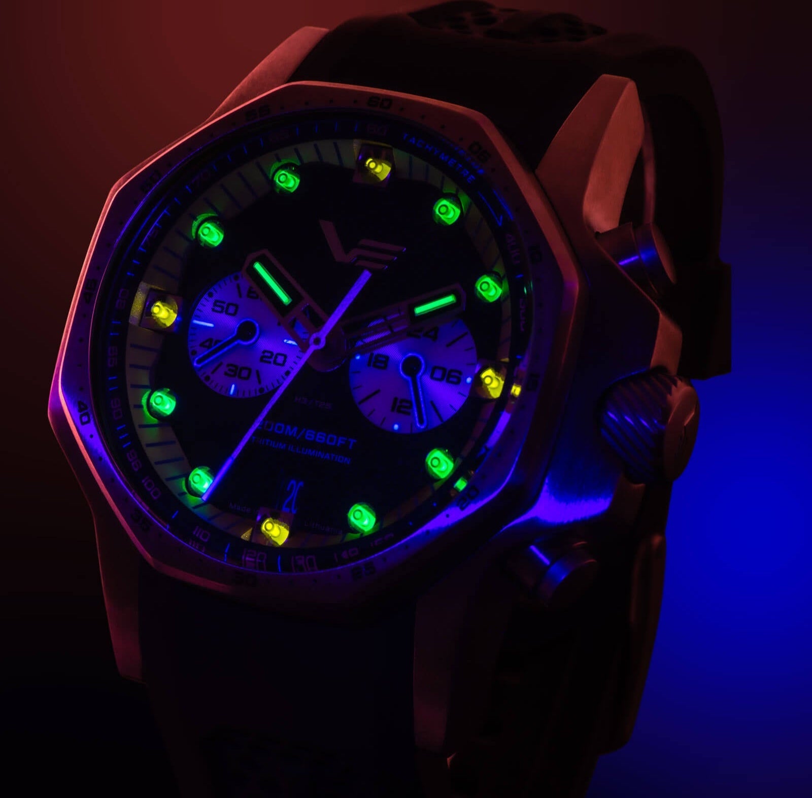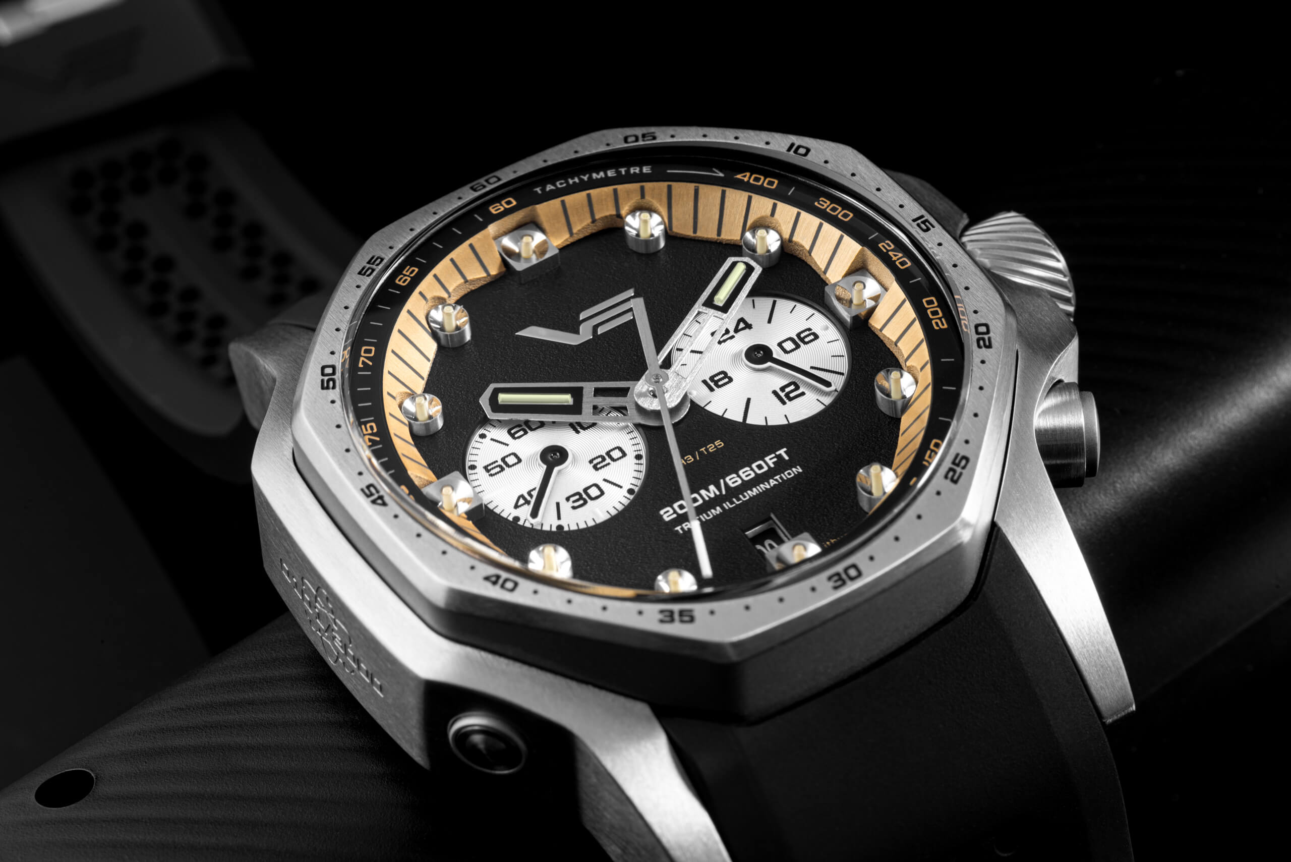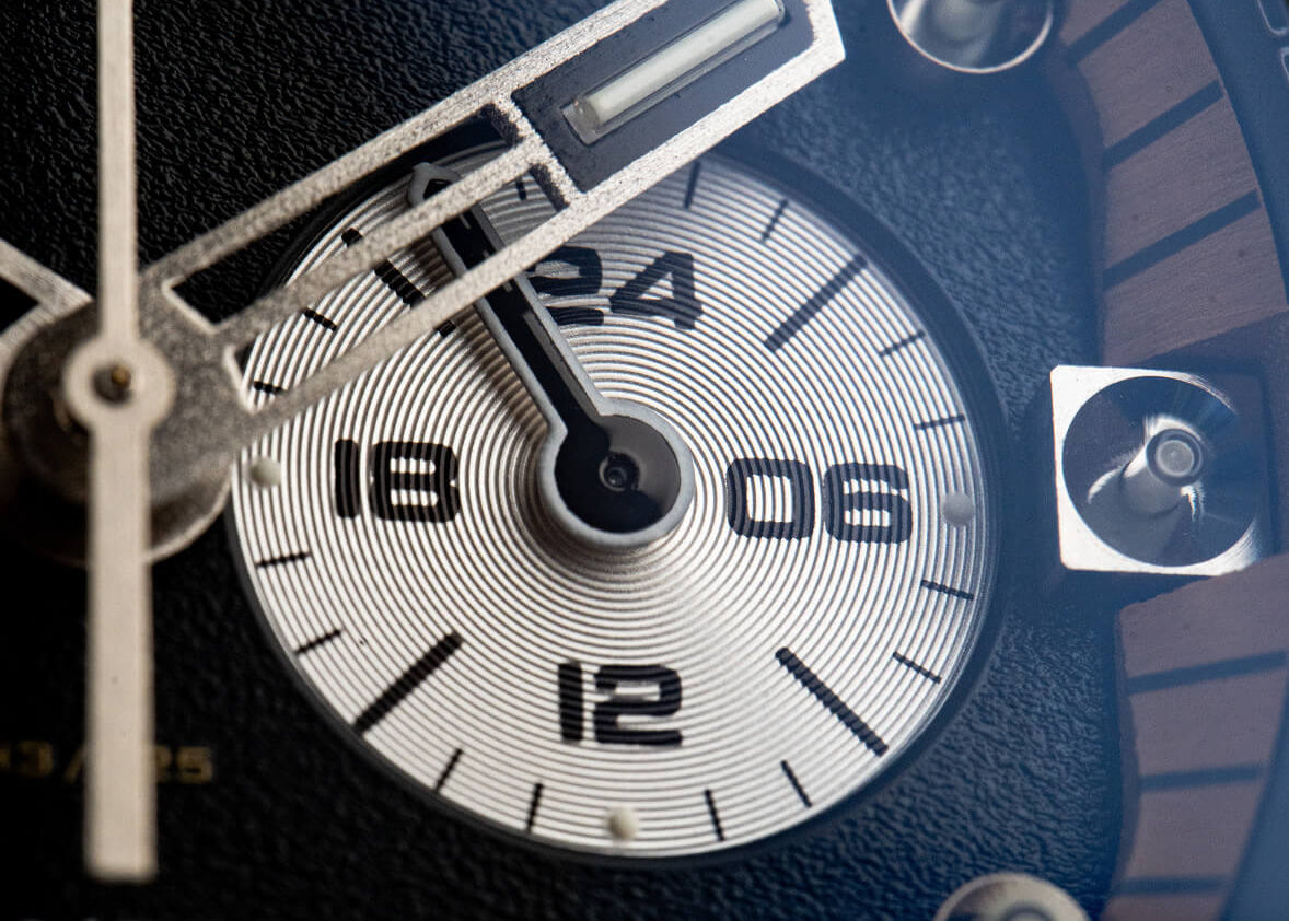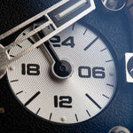 - The циферблат отличава се с отличителна зърнеста текстура и полирани метални индекси с вертикално монтирани тритиеви тръби които осигуряват изключителна, дълготрайна яркост — добавяйки нотка "Атомна енергия" към цялостния дизайн.