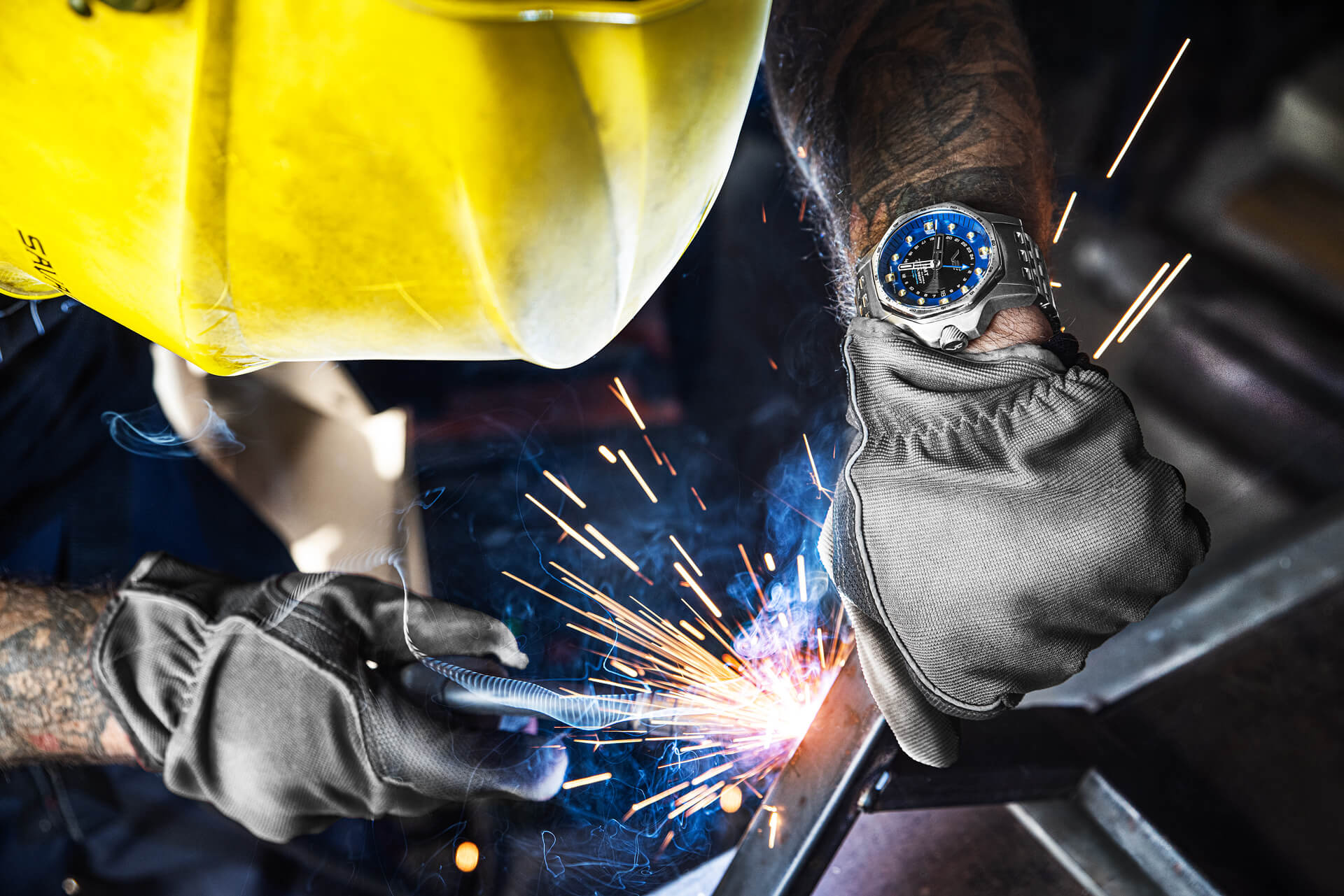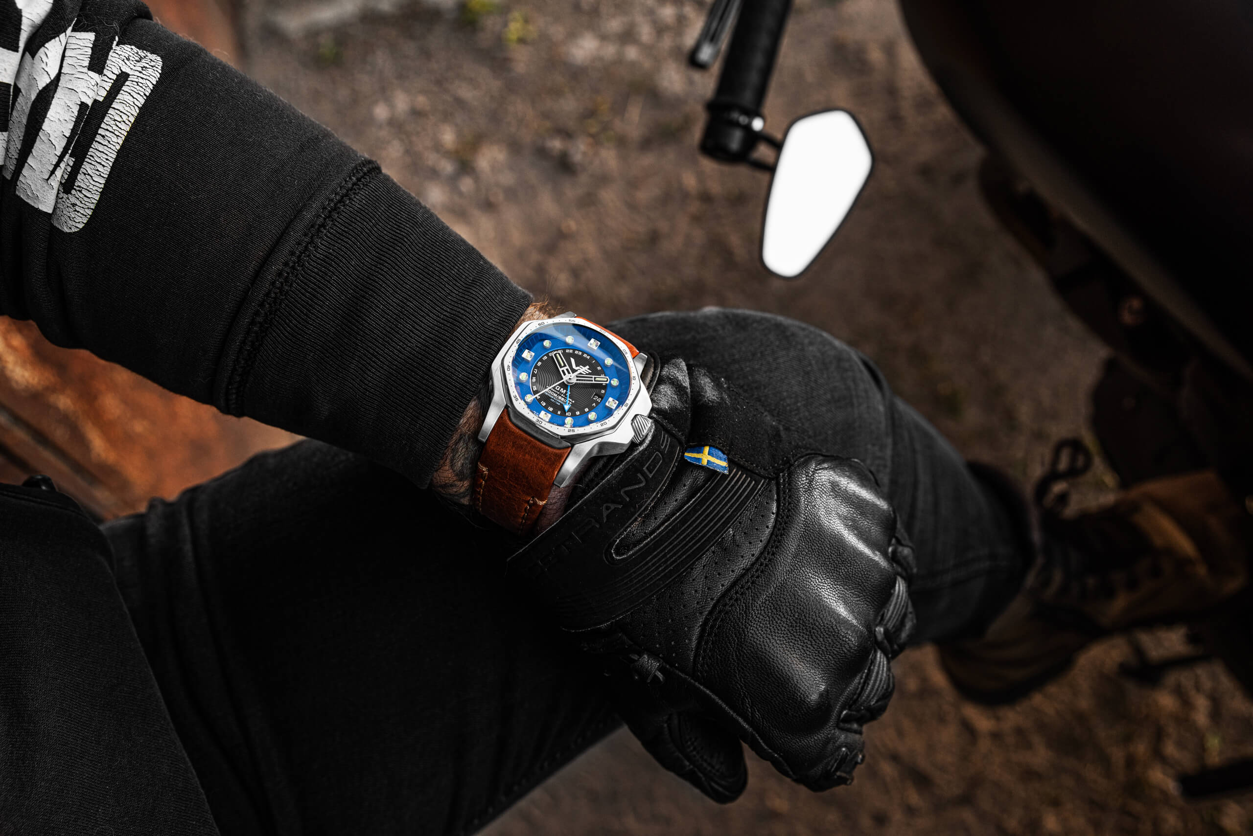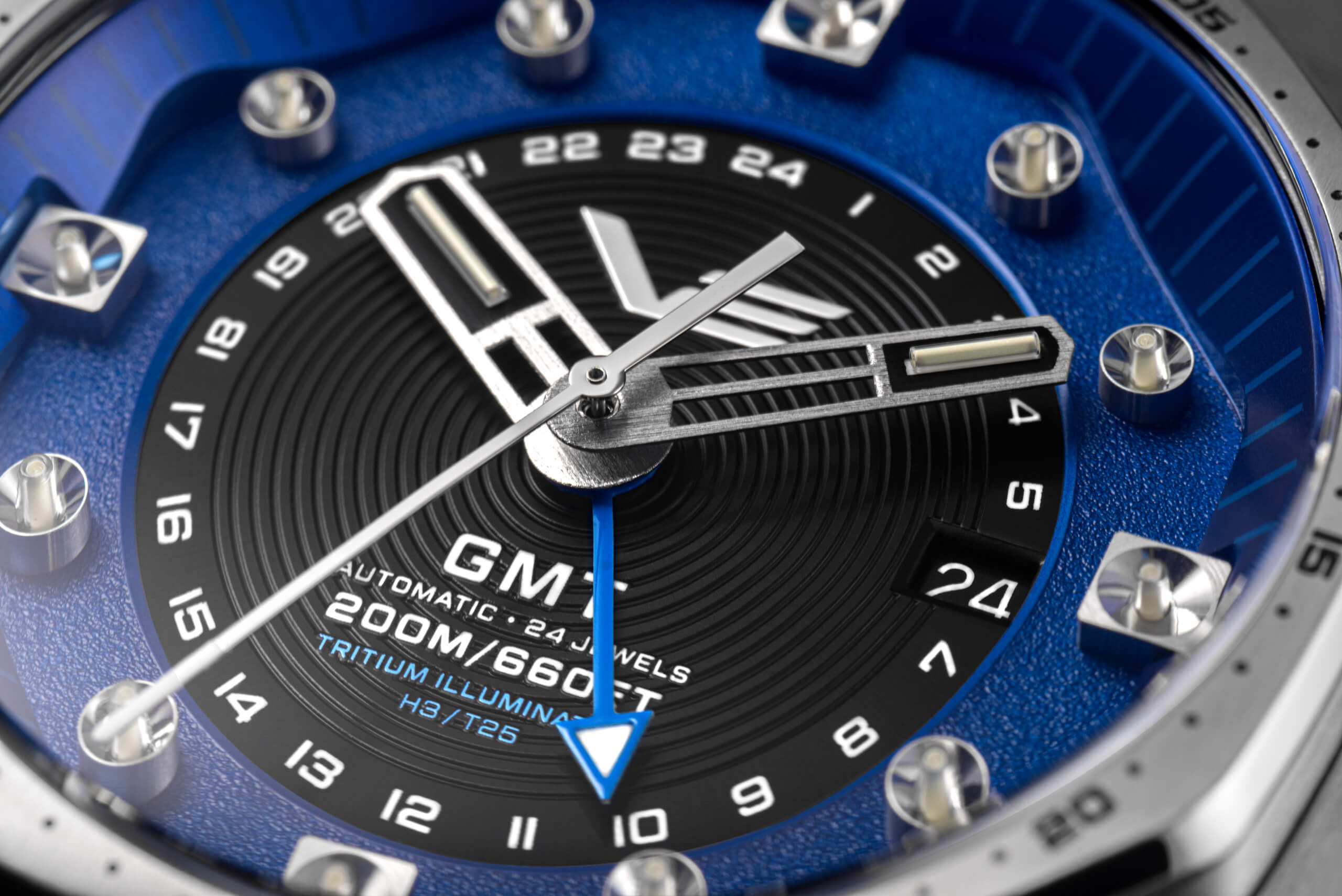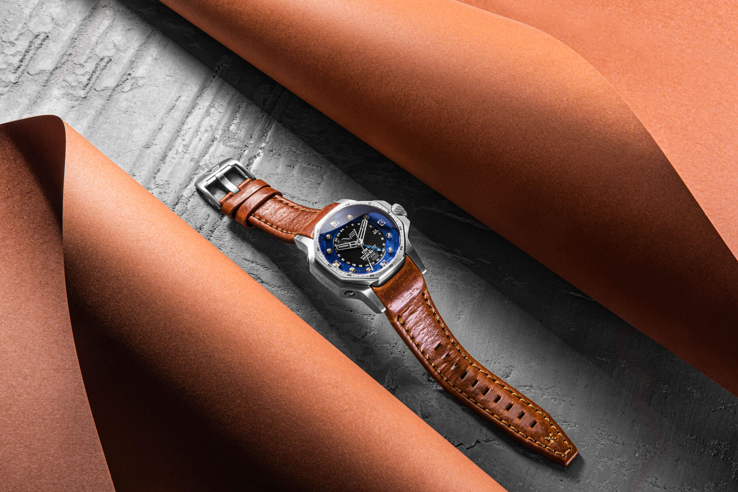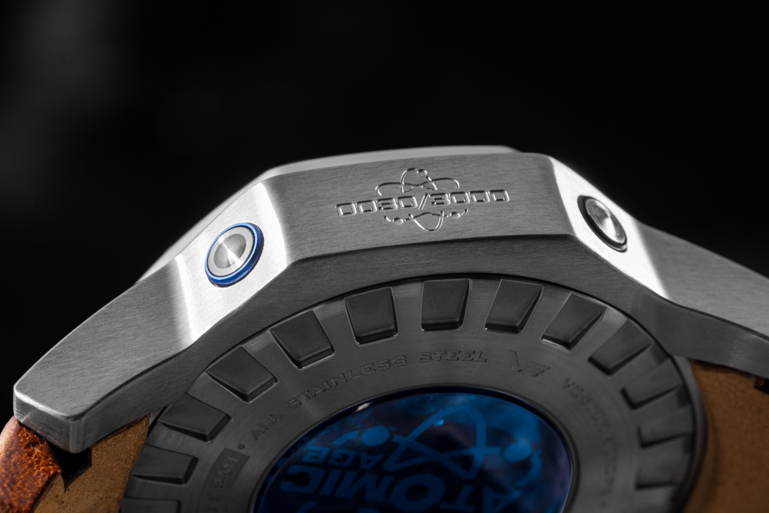 - The циферблат отличава се с отличителен текстура на зърното, допълнени от полирани метални индекси и вертикално монтирани тритиеви тръби, които осигуряват изключителна, дълготрайна светимост — добавяйки нотка "Атомна енергия" към цялостния дизайн.