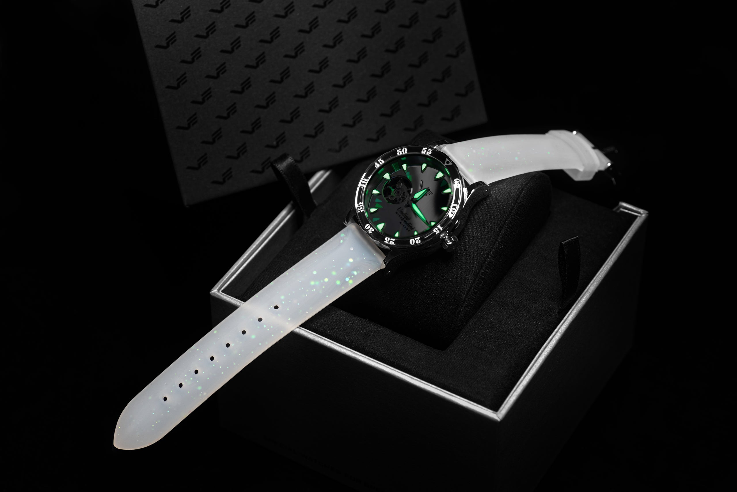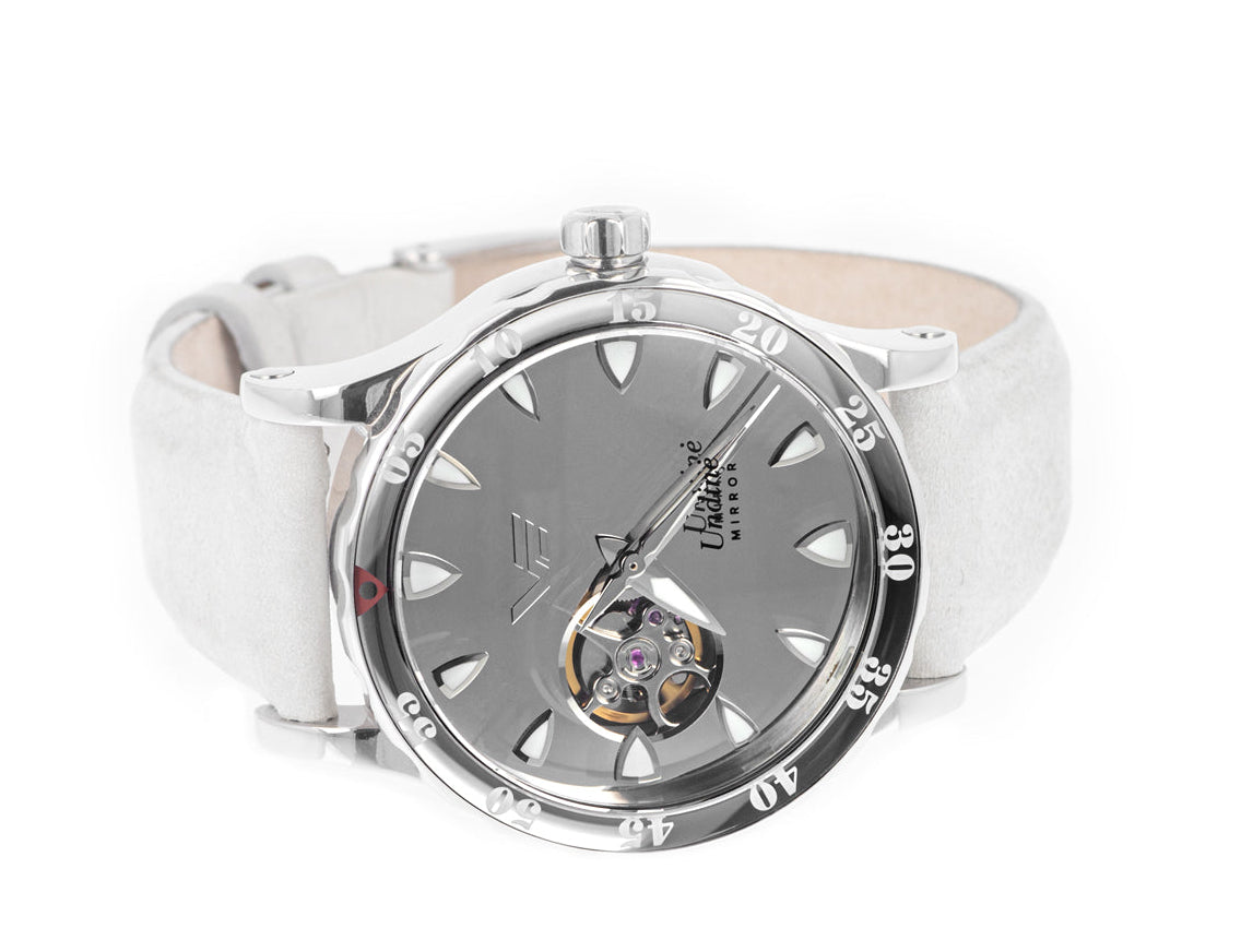 Tarcza tego zegarka wykonana jest z polerowanego metalu, wykończonego z lustrzaną perfekcją. Jej gładka, odblaskowa powierzchnia tworzy efektowny efekt wizualny. Tarczę chroni wytrzymałe szkło K1, a luminescencyjne indeksy z polerowanego metalu gwarantują doskonałą widoczność nawet w słabym świetle, przywodząc na myśl blask księżyca w blasku Undines.