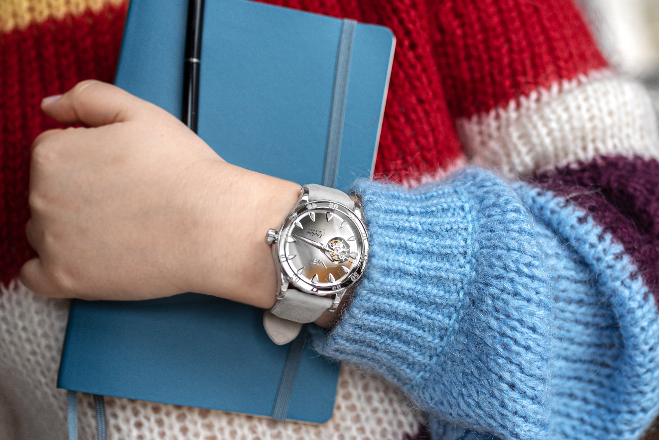 Ten zegarek to hołd dla kobiecej elegancji i tajemniczości połączonej z urzekającą mocą wody. Wyposażony jest w wykonany we Włoszech szary pasek zamszowy, półprzezroczysty z perłowym połyskiem oraz białe silikonowe paski, które można łatwo wymienić za pomocą zatrzasków sprężynowych.