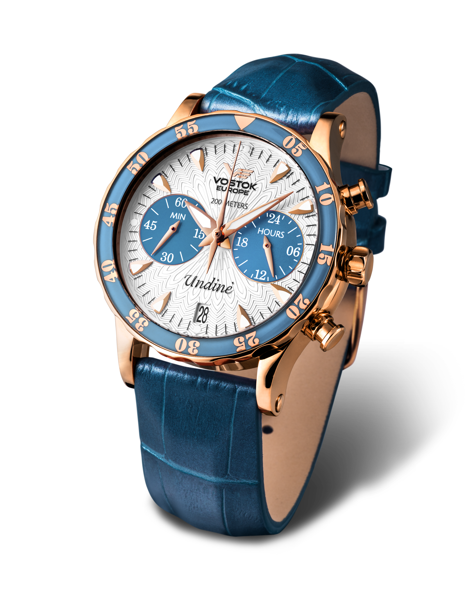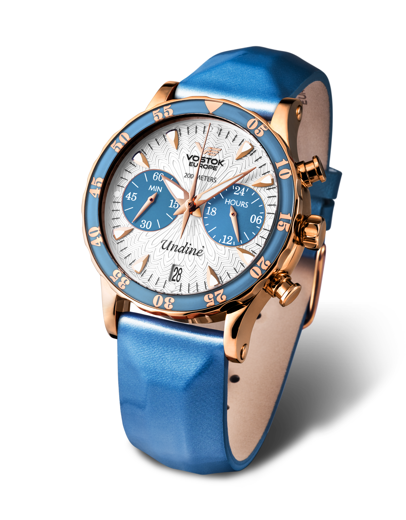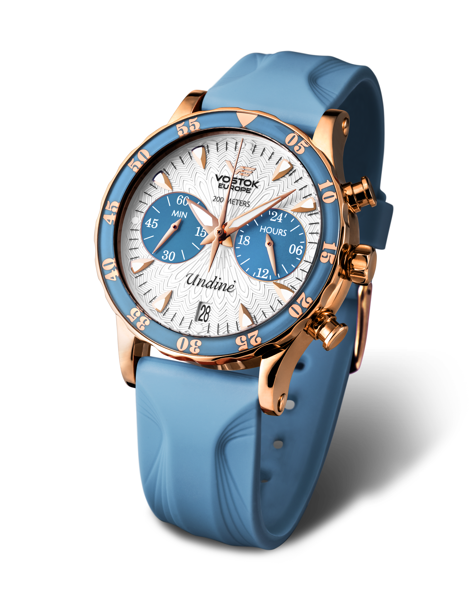 Ten zegarek łączy styl i funkcjonalność w stalowej kopercie o średnicy 39 mm, zaprojektowanej tak, aby dopełnić elegancję nowoczesnej kobiety, zachowując jednocześnie wszechstronność pasującą do aktywnego trybu życia. Obrotowy pierścień nurkowy i solidna wodoodporność do 200 metrów (20 barów) sprawiają, że zegarek jest równie praktyczny podczas aktywności na świeżym powietrzu, pływania, a nawet nurkowania, co na co dzień. Teksturowaną tarczę chroni wytrzymałe szkło K1, a luminescencyjne oznaczenia na polerowanych metalowych indeksach gwarantują doskonałą widoczność nawet przy słabym oświetleniu, nawiązując do blasku księżyca w blasku Undines. Specjalny japoński mechanizm kwarcowy z centralną wskazówką chronografu zapewnia długą żywotność baterii i niskie koszty konserwacji.