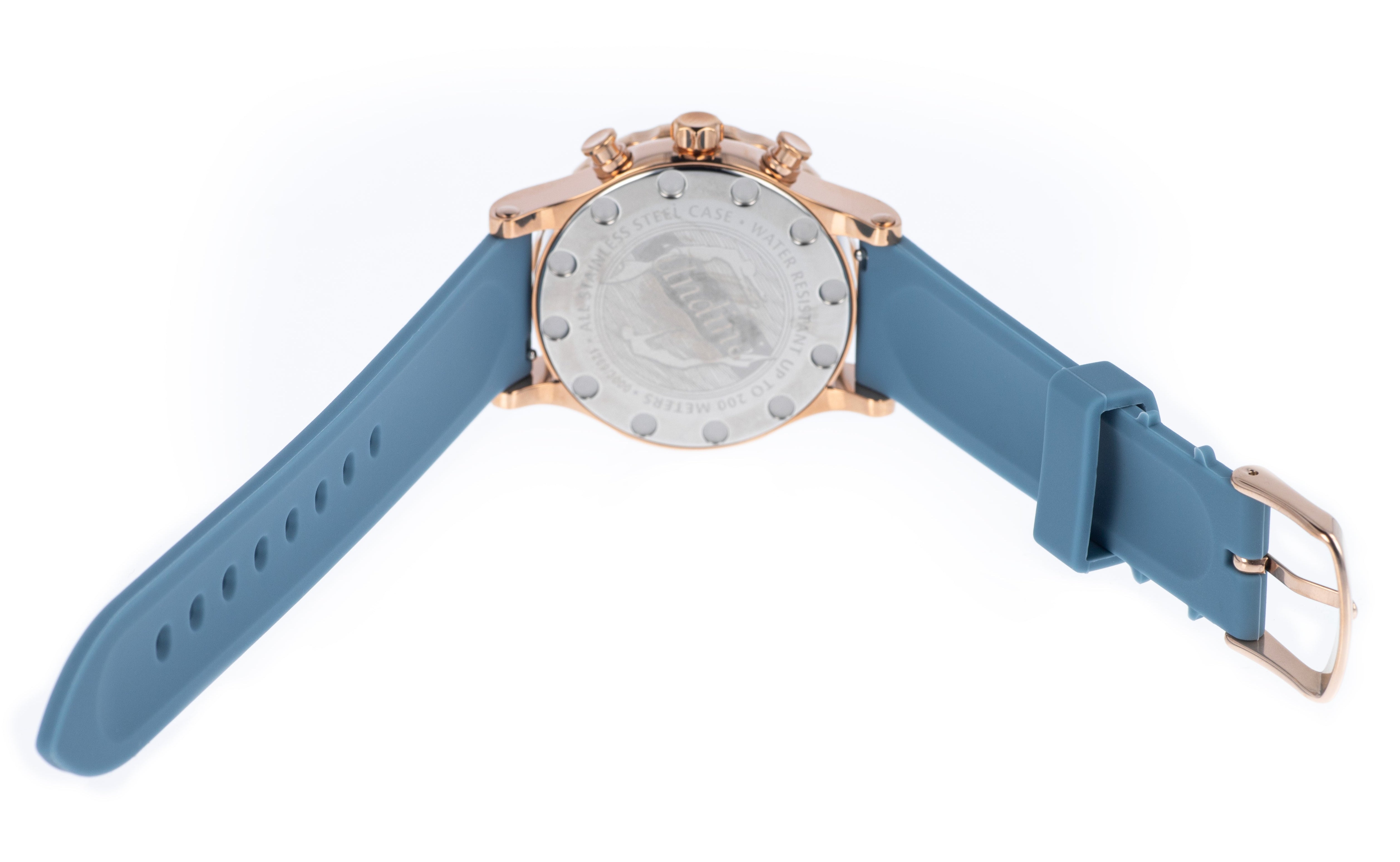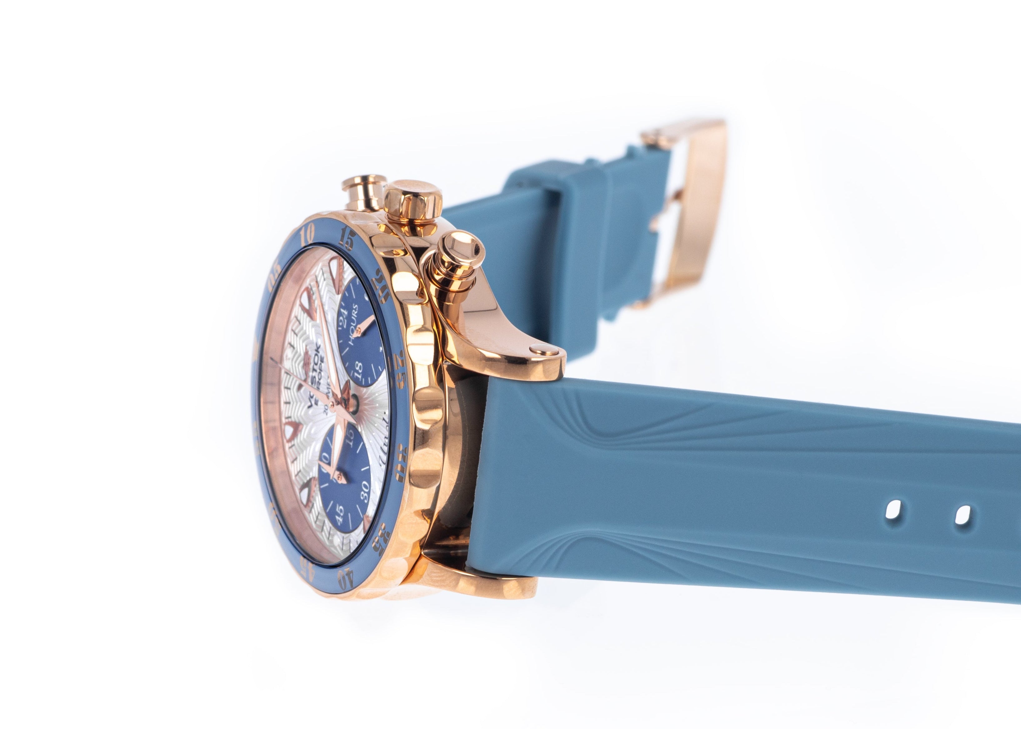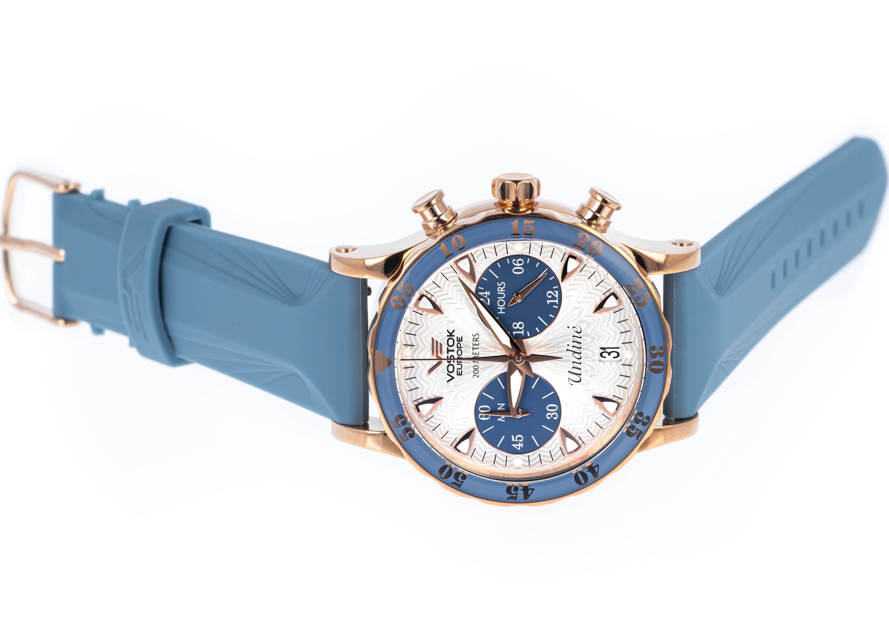Ten zegarek łączy styl i funkcjonalność w stalowej kopercie o średnicy 39 mm, zaprojektowanej tak, aby dopełnić elegancję nowoczesnej kobiety, zachowując jednocześnie wszechstronność pasującą do aktywnego trybu życia. Obrotowy pierścień nurkowy i solidna wodoodporność do 200 metrów (20 barów) sprawiają, że zegarek jest równie praktyczny podczas aktywności na świeżym powietrzu, pływania, a nawet nurkowania, co na co dzień. Teksturowaną tarczę chroni wytrzymałe szkło K1, a luminescencyjne oznaczenia na polerowanych metalowych indeksach gwarantują doskonałą widoczność nawet przy słabym oświetleniu, nawiązując do blasku księżyca w blasku Undines. Specjalny japoński mechanizm kwarcowy z centralną wskazówką chronografu zapewnia długą żywotność baterii i niskie koszty konserwacji.