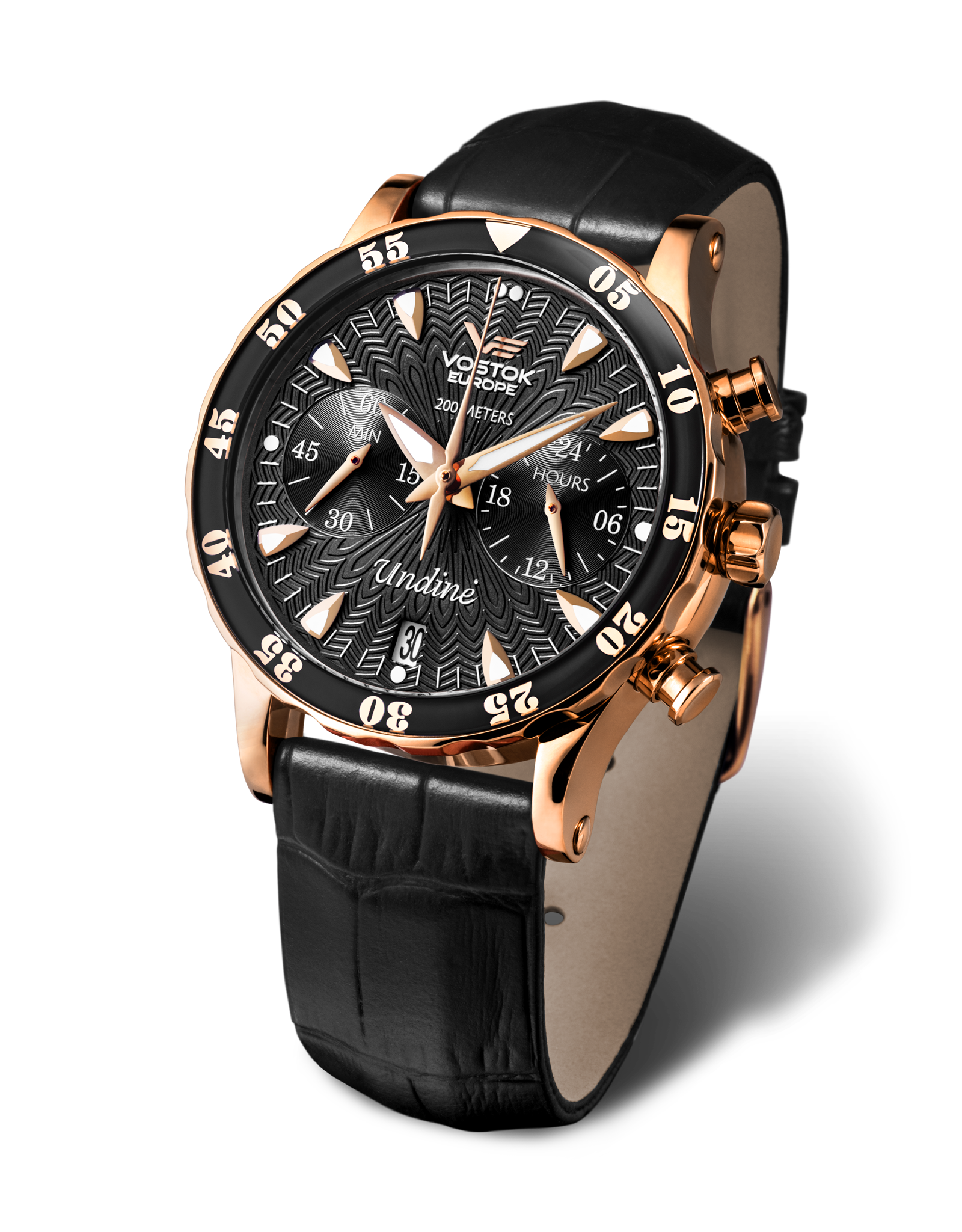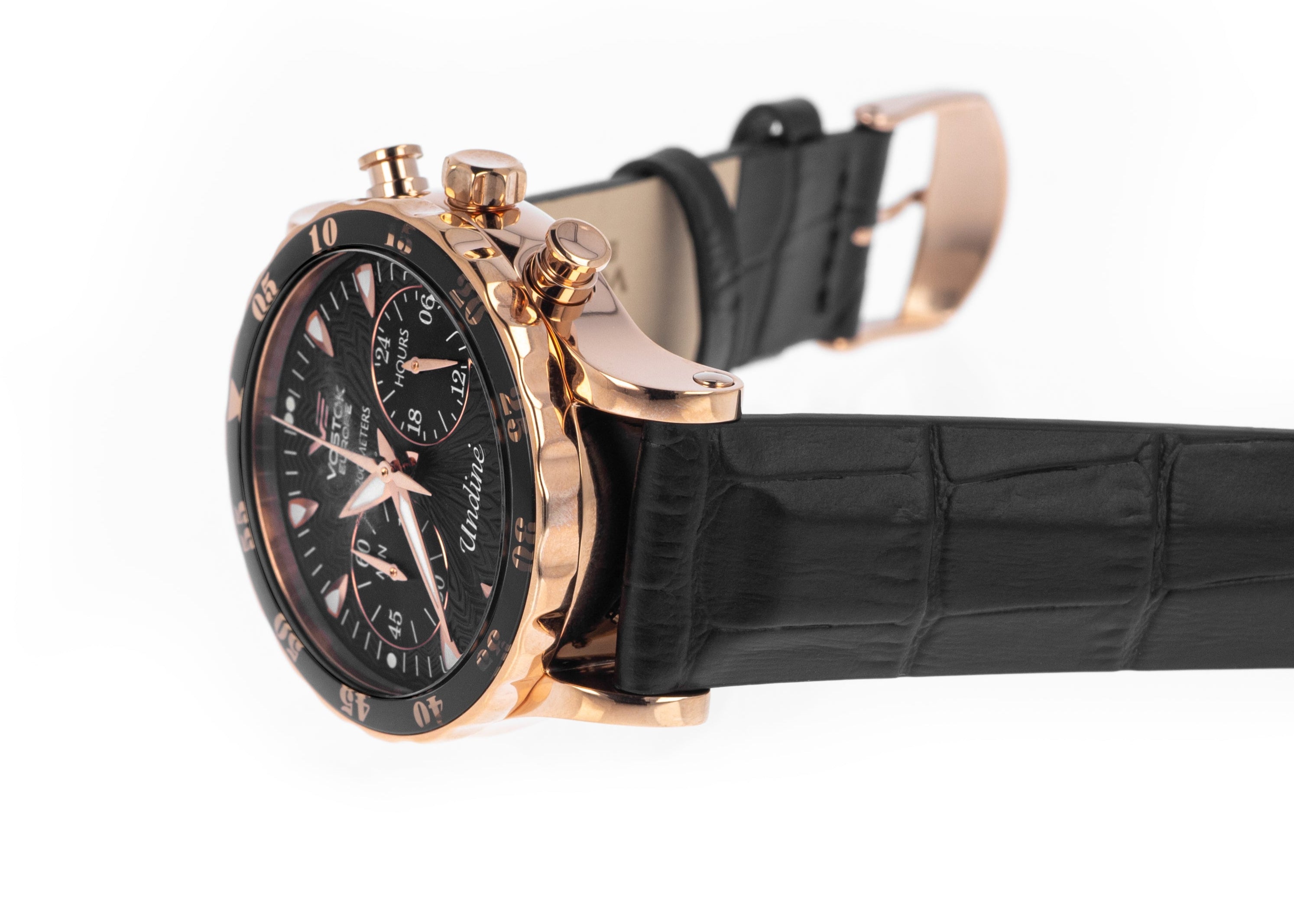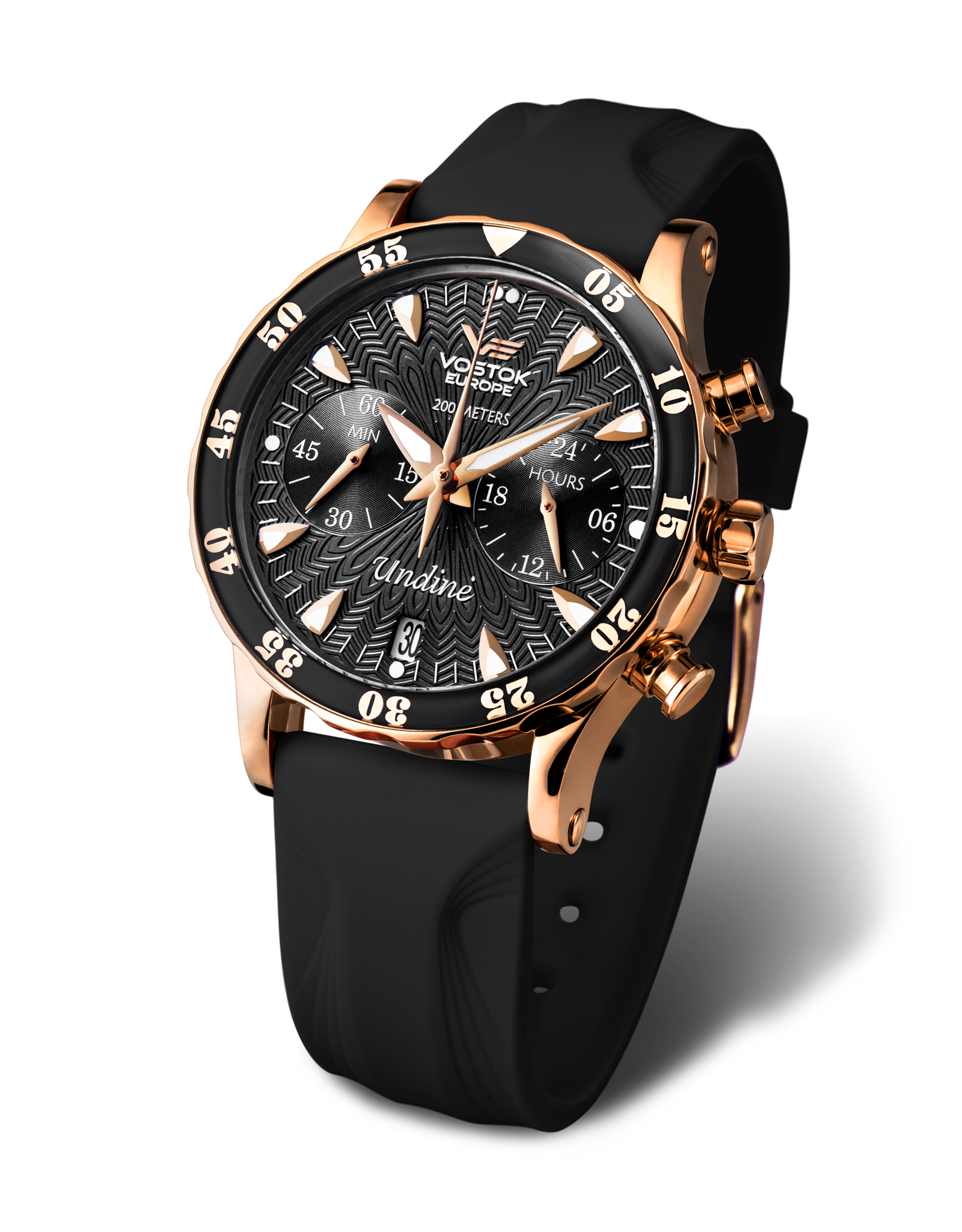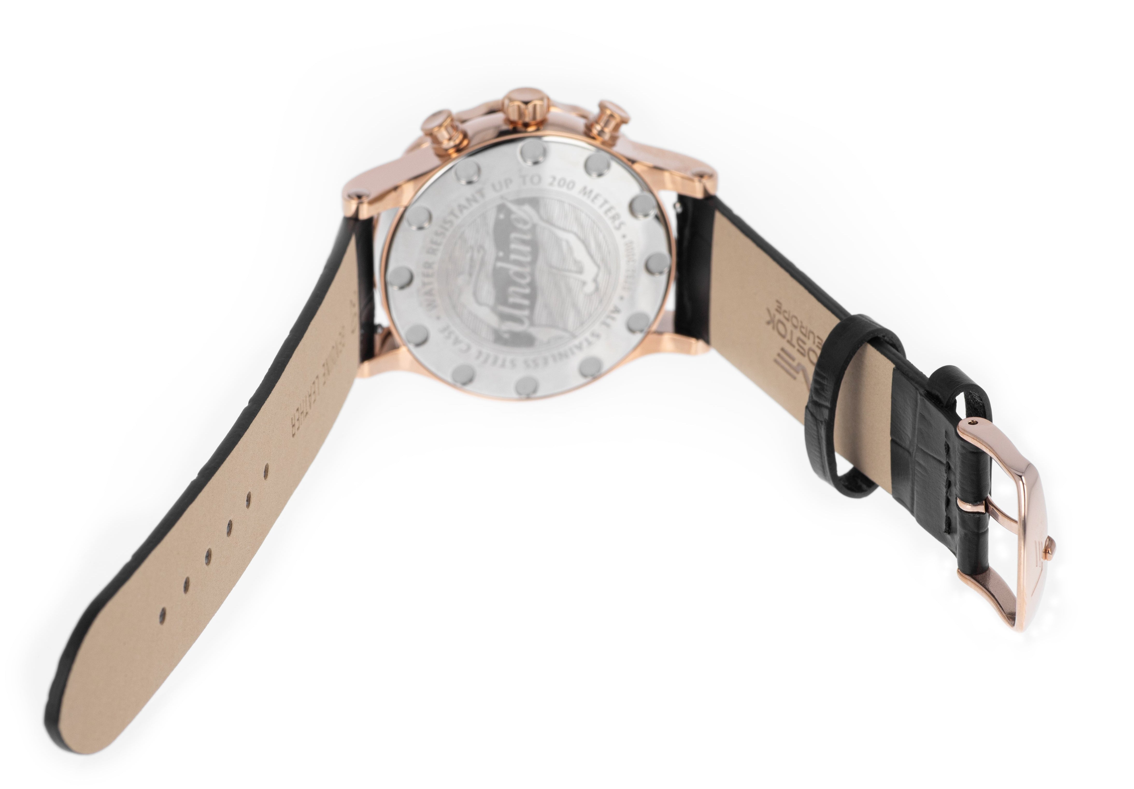 Obrotowy pierścień nurkowy i solidna wodoodporność do 20 barów (200 metrów) sprawiają, że zegarek jest równie praktyczny podczas aktywności na świeżym powietrzu, pływania, a nawet nurkowania, co na co dzień. Teksturowaną tarczę chroni wytrzymałe szkło K1, a luminescencyjne oznaczenia na polerowanych metalowych indeksach gwarantują doskonałą widoczność nawet przy słabym oświetleniu, przywodząc na myśl blask księżyca w zegarku Undines.