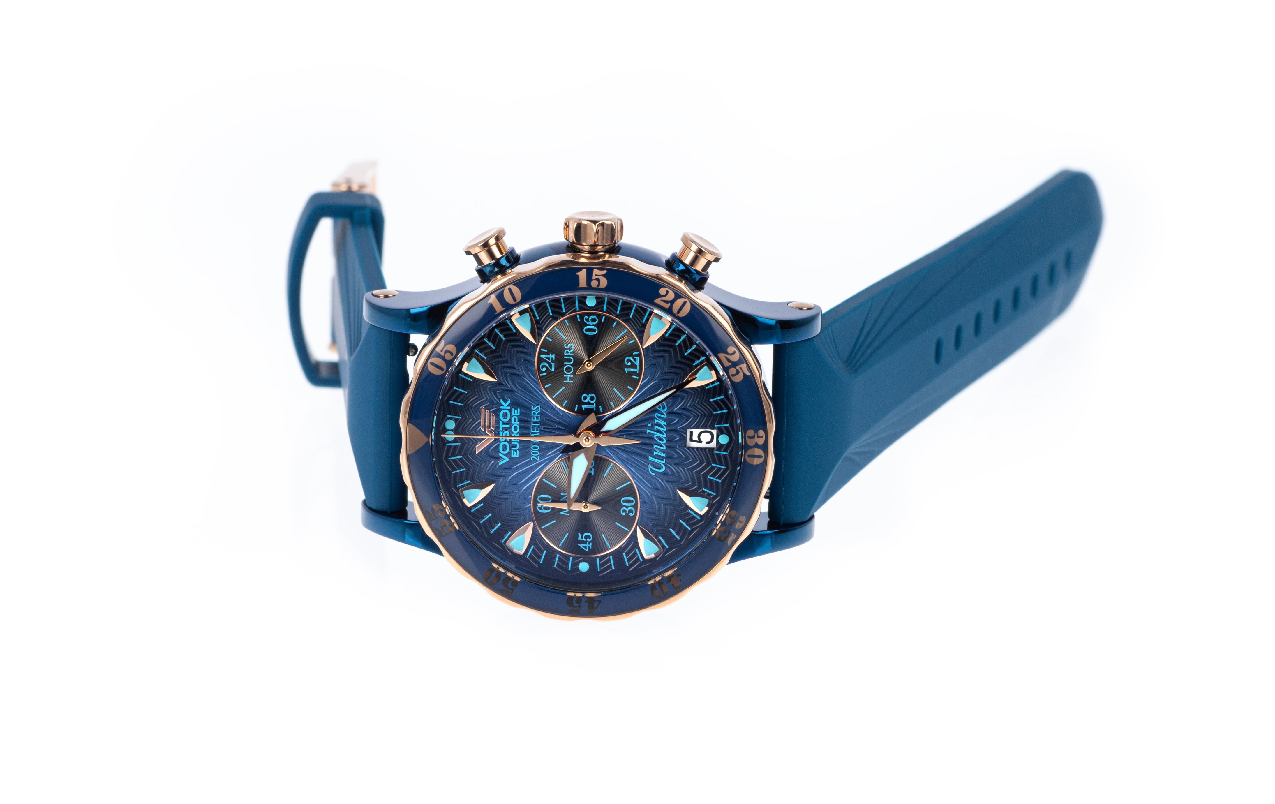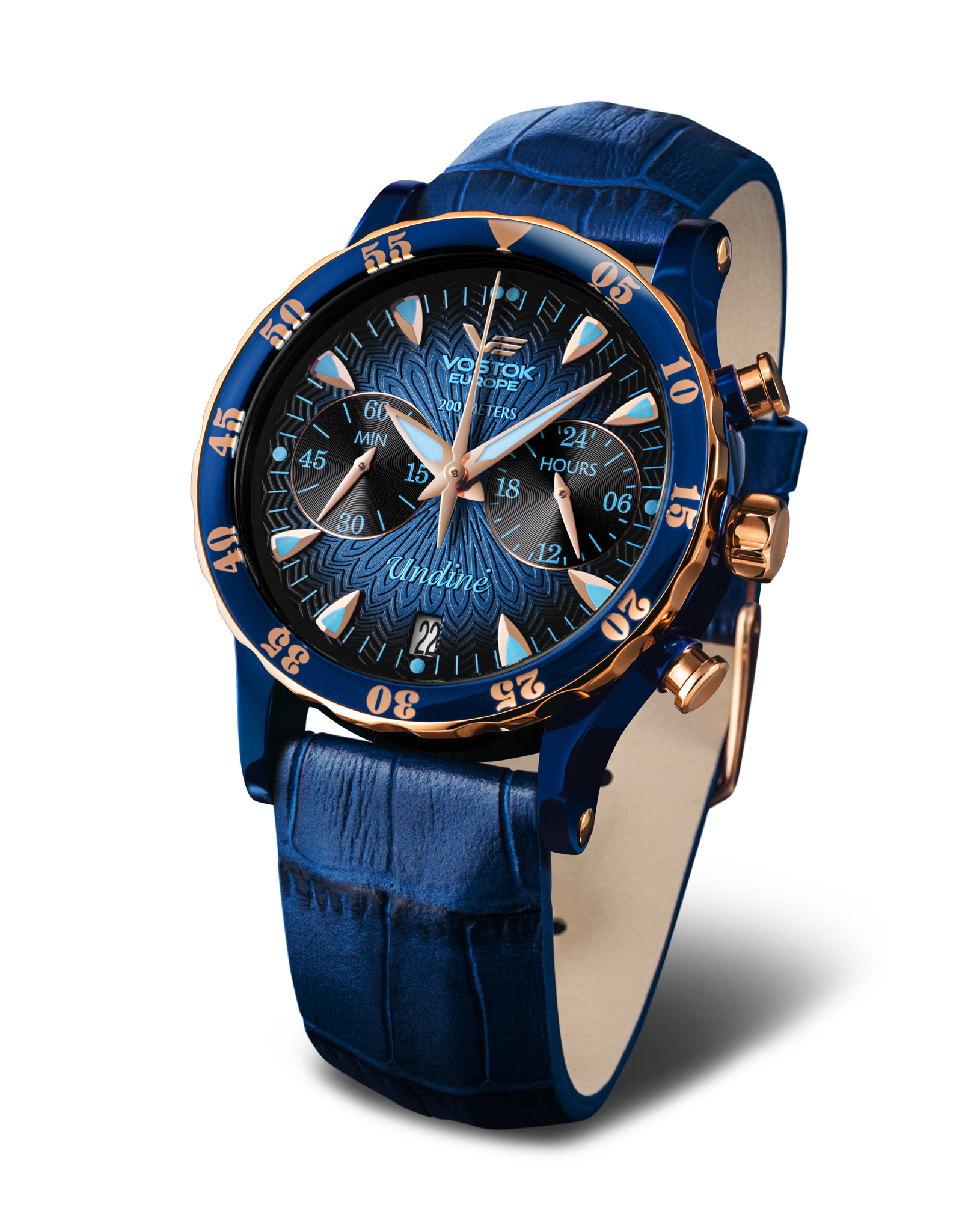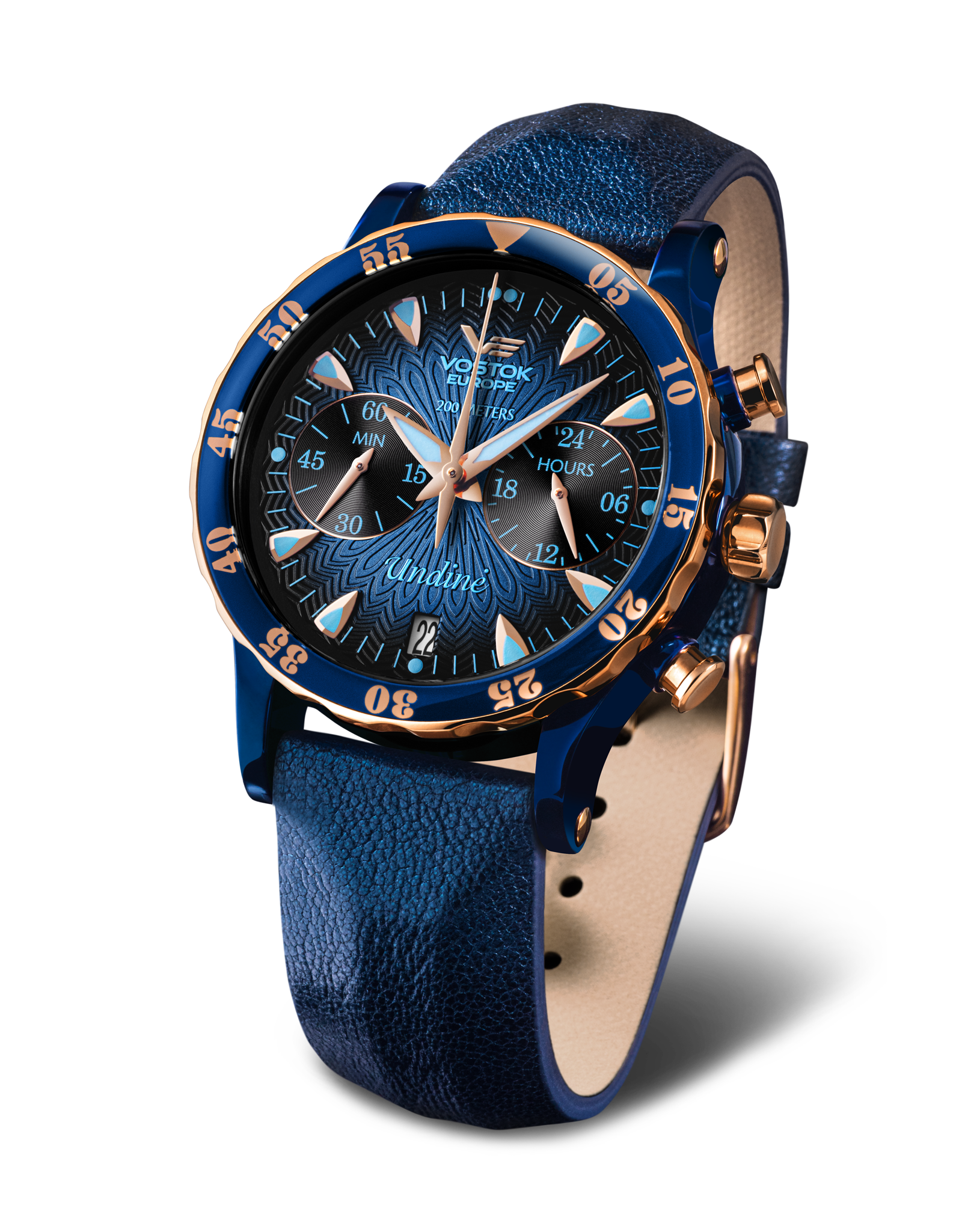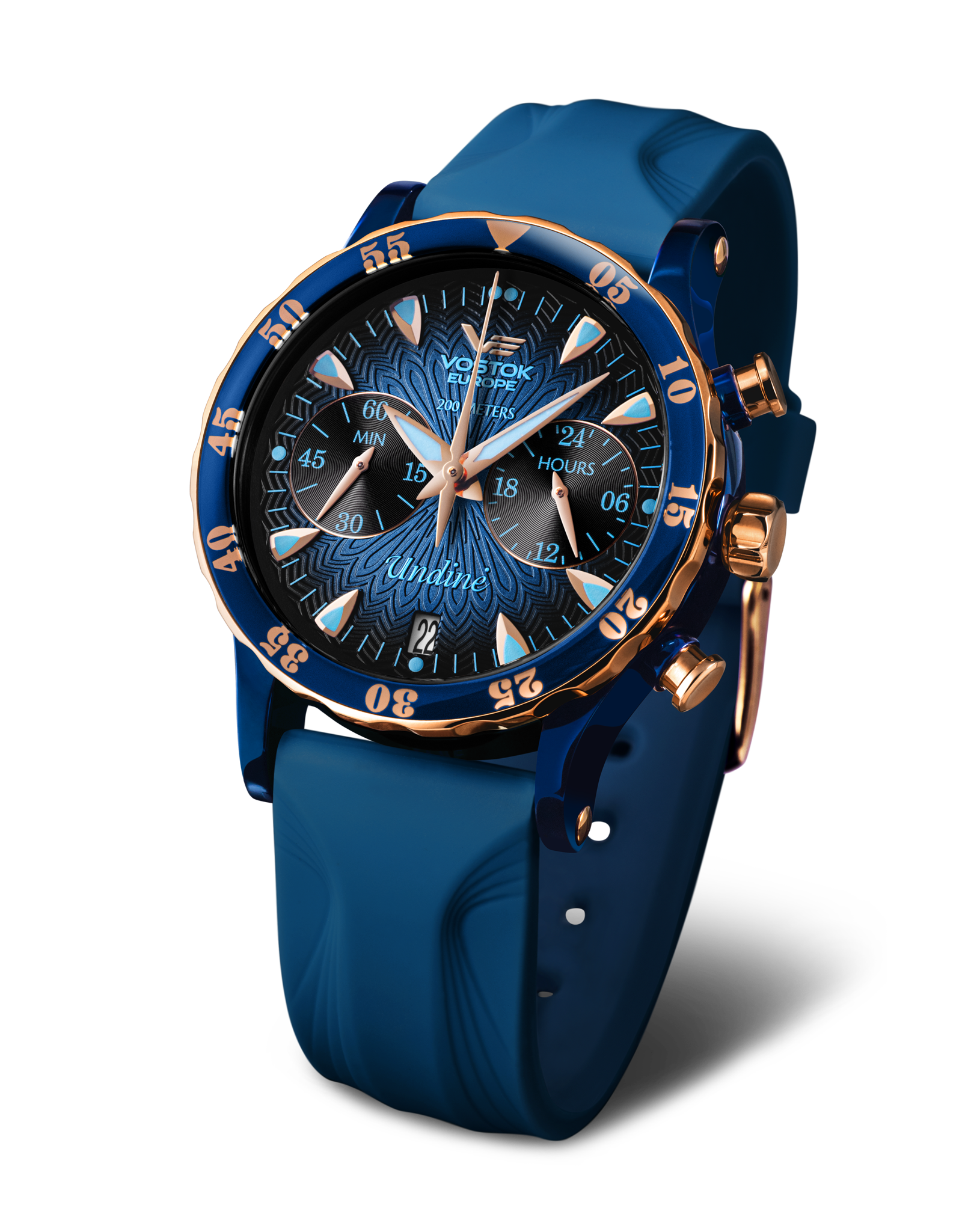 Obrotowy pierścień nurkowy i solidna wodoodporność do 20 barów (200 metrów) sprawiają, że zegarek jest równie praktyczny podczas aktywności na świeżym powietrzu, pływania, a nawet nurkowania, co na co dzień. Teksturowaną tarczę chroni wytrzymałe szkło K1, a luminescencyjne oznaczenia na polerowanych metalowych indeksach gwarantują doskonałą widoczność nawet przy słabym oświetleniu, przywodząc na myśl blask księżyca w zegarku Undines.