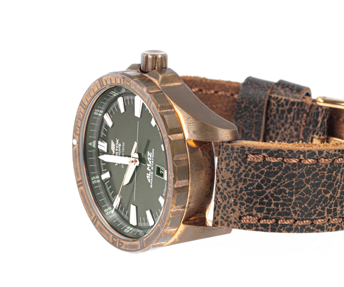 - Acest ceas este realizat integral dinbronz autentic,renumit pentru construcția superioară a carcasei și prelucrabilitatea. Datorită compoziției sale din cupru și staniu, metalul se oxidează în mod natural în timp, dezvoltând o patină captivantă care începe să apară după doar câteva săptămâni de purtare. Această patină în continuă evoluție asigură că fiecare ceas devine un...o piesă cu adevărat unică,cu o colorare distinctă, personală pentru fiecare proprietar.