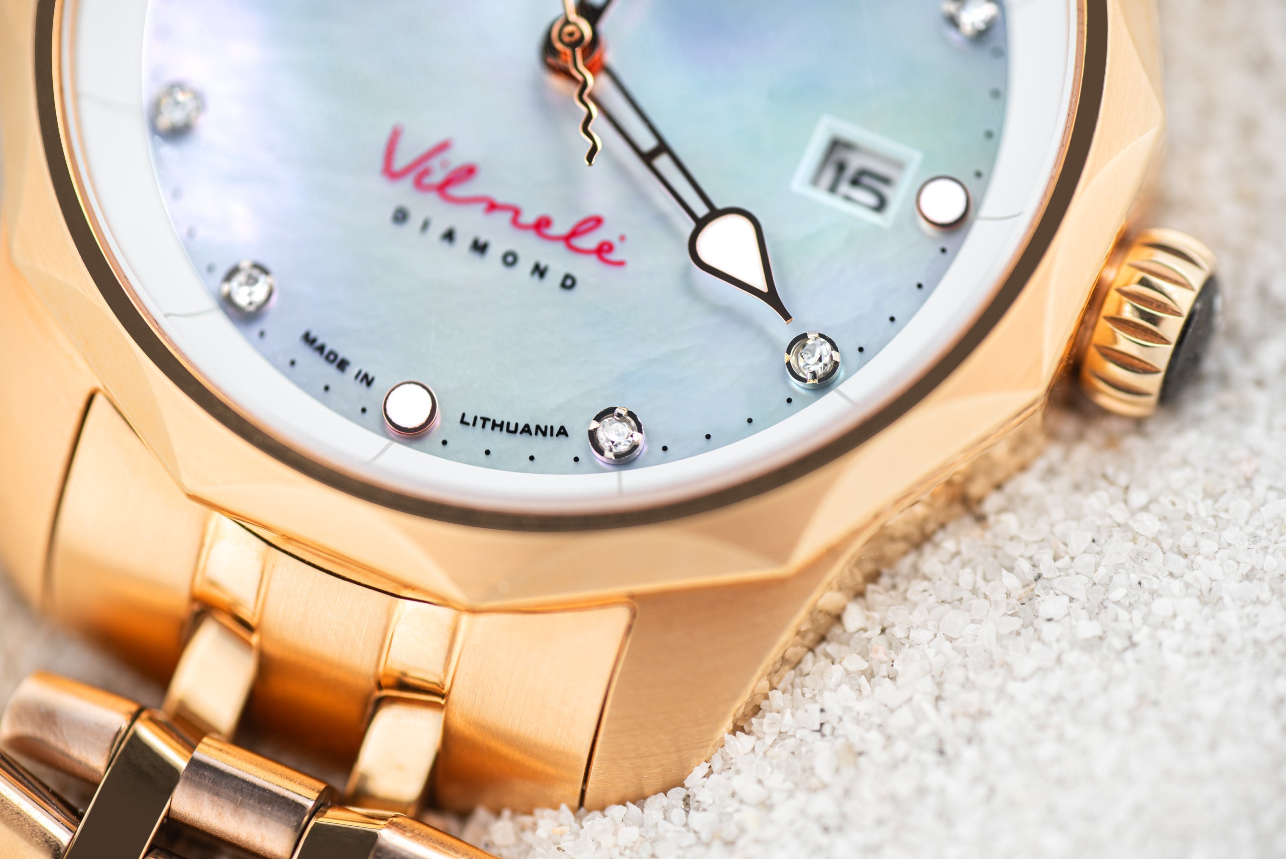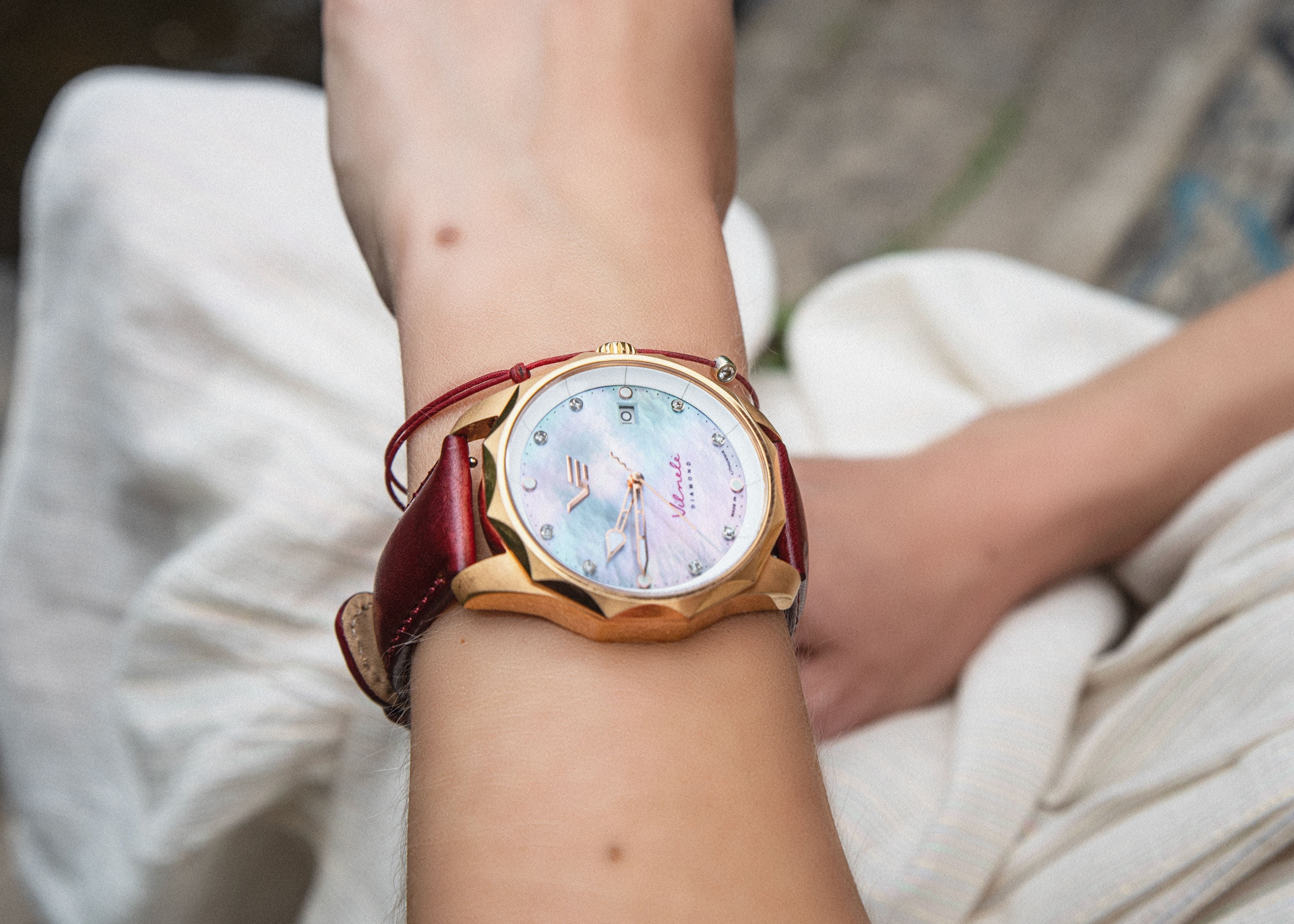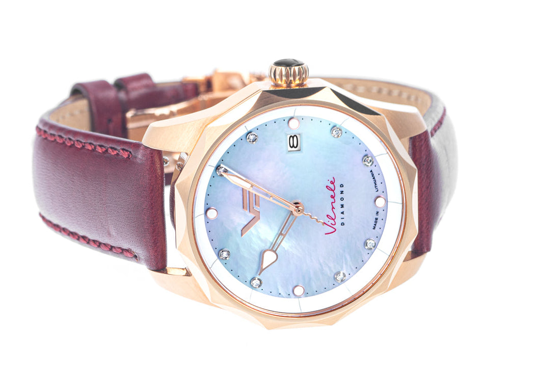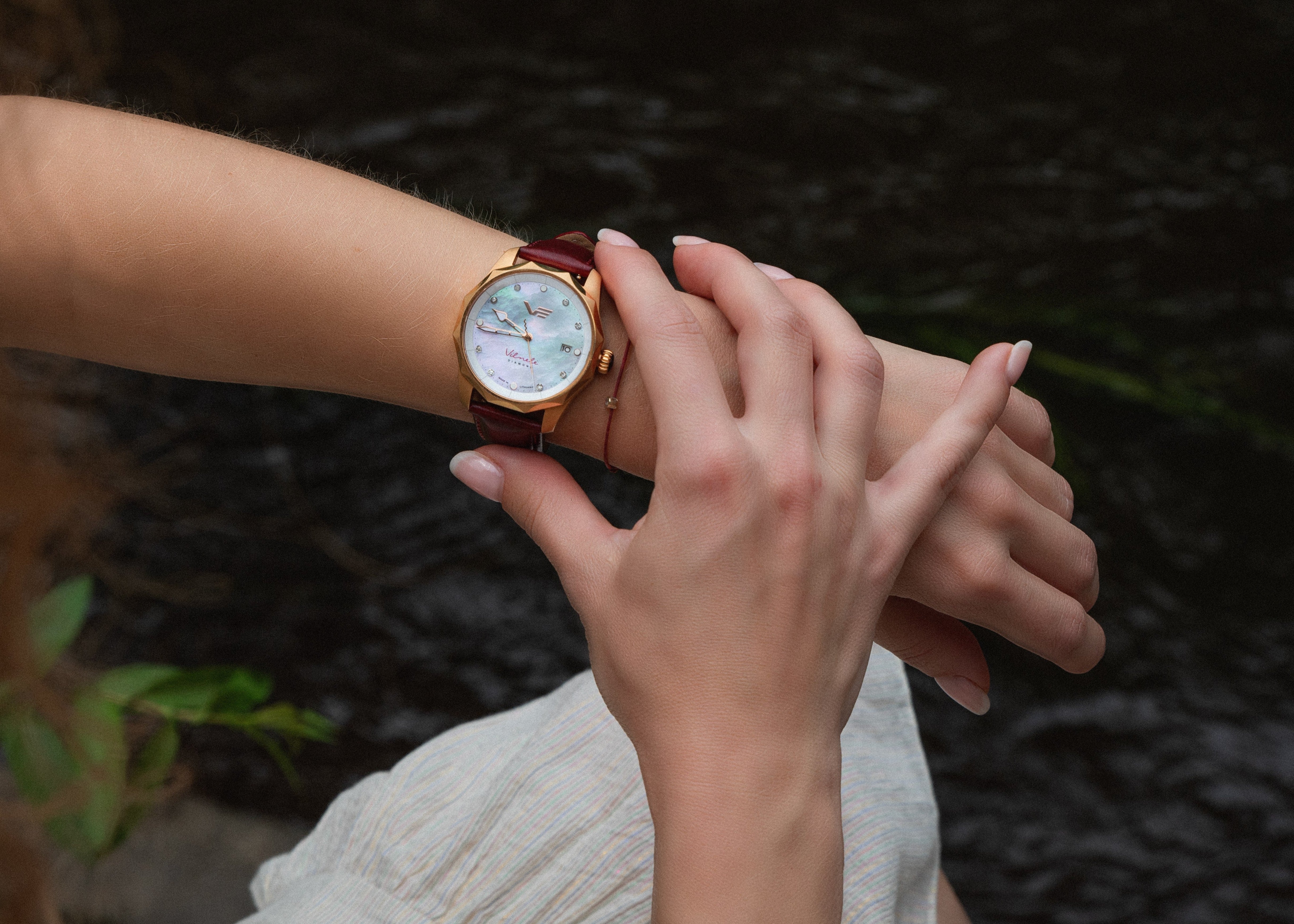 Acest model este alimentat de un mecanism solar Seiko Epson și prezintă uncadran semitransparent din sidef, accentuat cu8 diamante autentice— o notă delicată de lux.