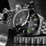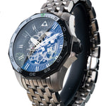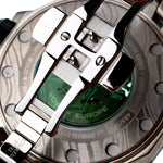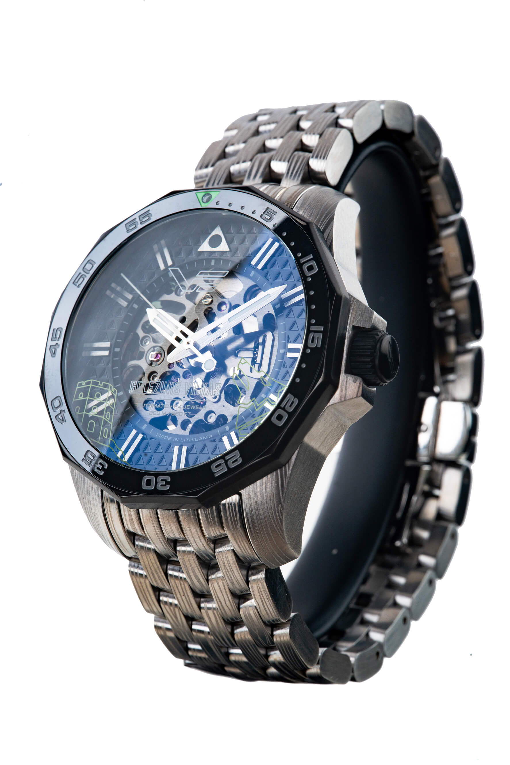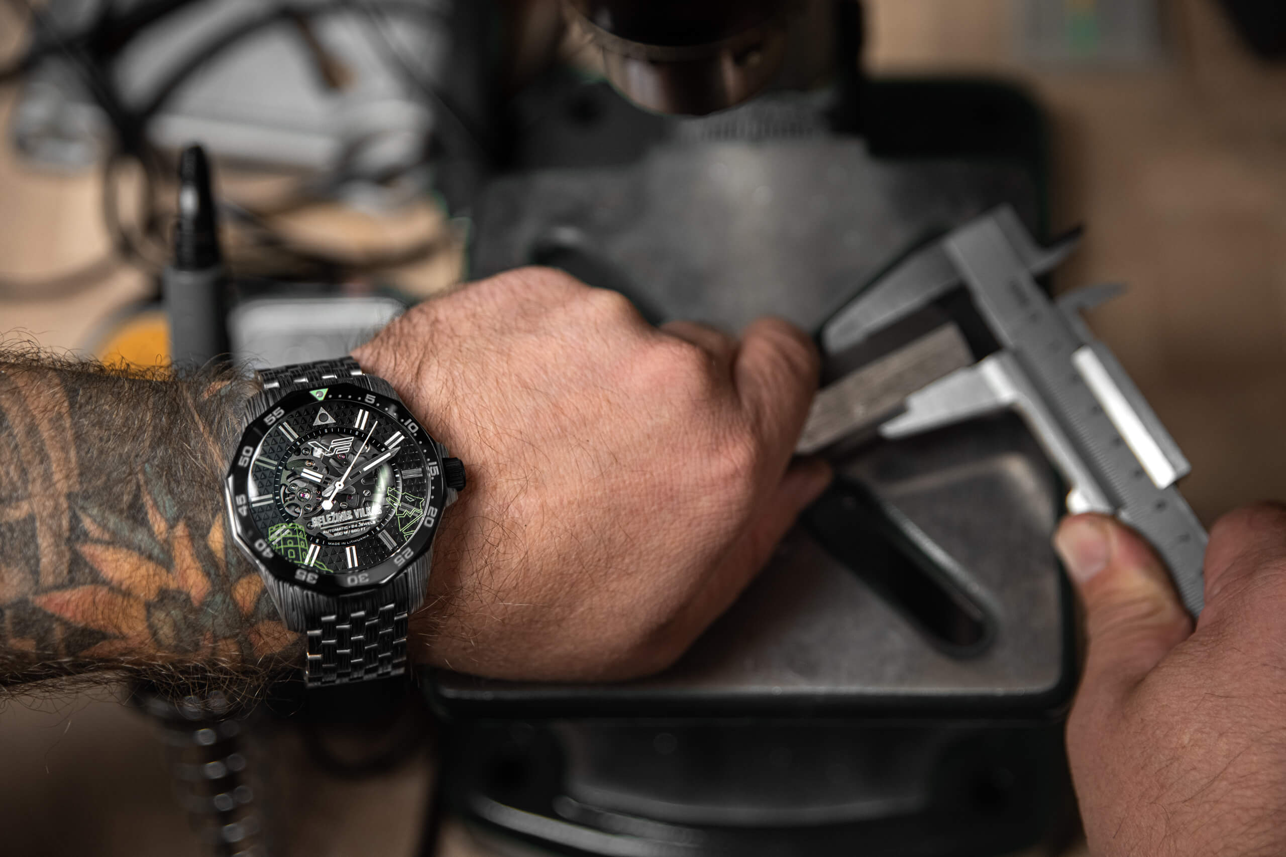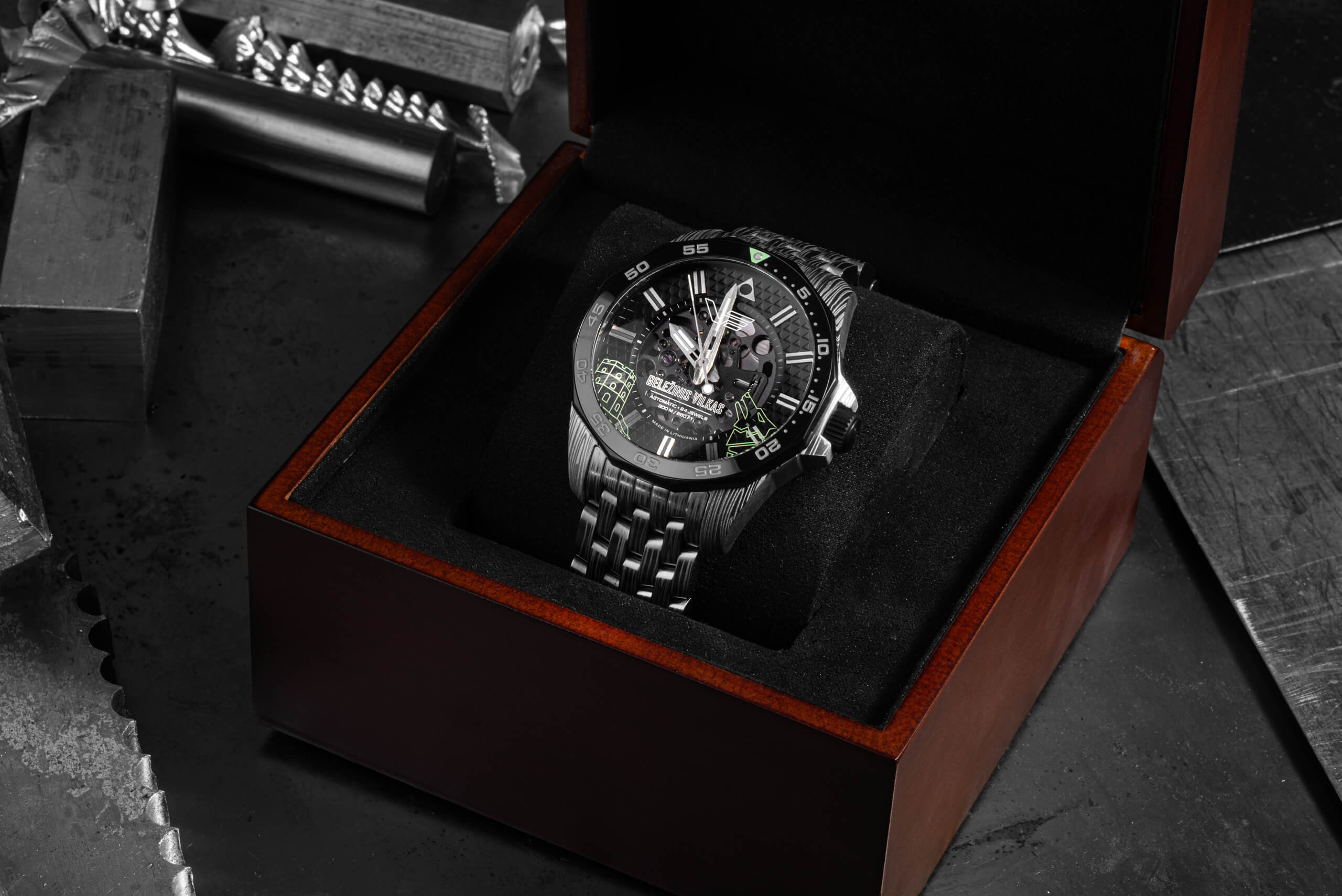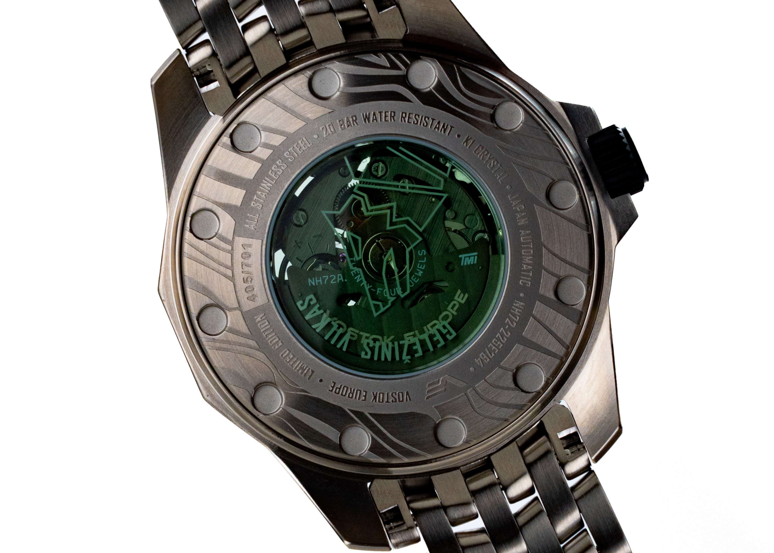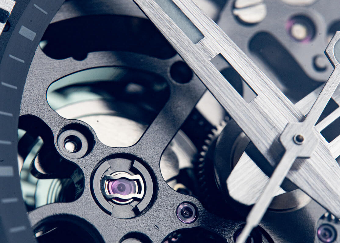 • În miezul său bate ojaponezmișcarea scheletuluidin grupul TMI,finisat cu un strat de ruteniu și evidențiat prin designul deschis al cadranului.